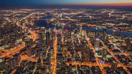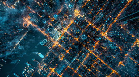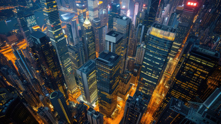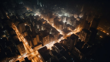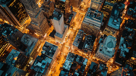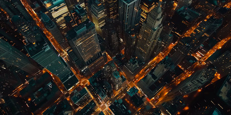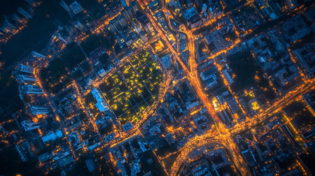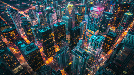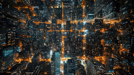 Stunning aerial view of a vibrant cityscape at night, showcasing illuminated streets and skyscrapers, capturing the essence of urban life and beauty.