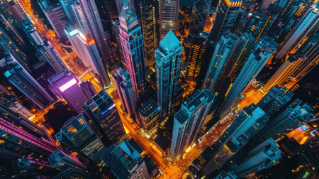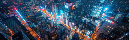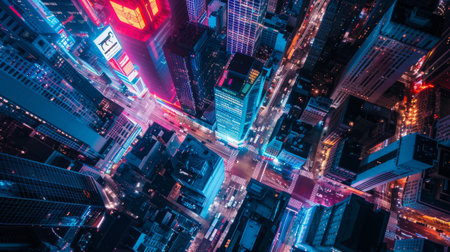Top view of a vibrant cityscape at night, with illuminated skyscrapers, colorful neon lights, and busy streets creating a lively atmosphere.