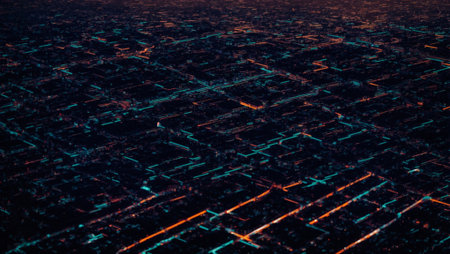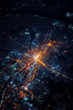 Aerial perspective of a cityscape at night showcasing glowing streets, highways, and urban structures. The lights create intricate patterns across the dark landscape.