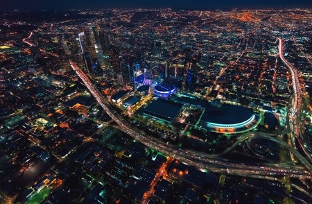Panoramic cityscape aerial view of city at night with street lights and huge architecture buildings.