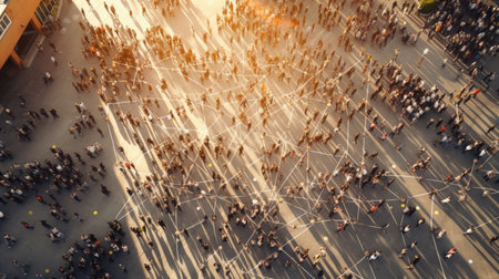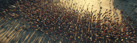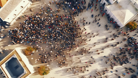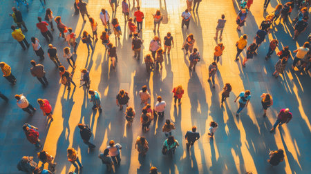 Captivating aerial view of a diverse crowd gathering in an urban setting under warm sunlight, creating dynamic shadows and showcasing lively social interaction.