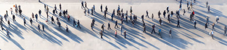 An overhead view captures the lively essence of urban life, featuring a diverse crowd moving through a public space under bright sunlight, creating striking shadows.