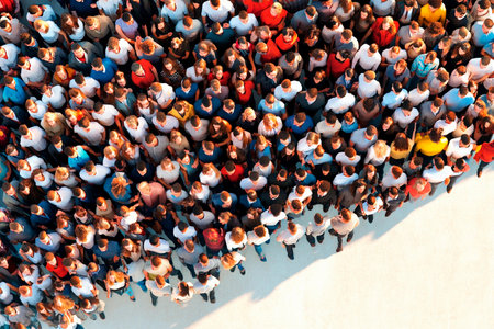 An impressive aerial view showcases a large diverse crowd gathered together, featuring vibrant colors and an energetic atmosphere, perfect for illustrating togetherness.