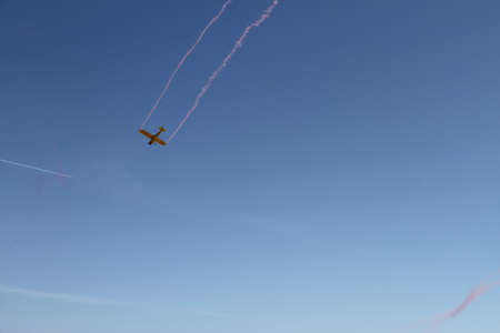 Aerobatics, air show. Aircraft team performing in the sky with white lines and blue sky