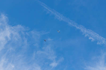 In a blue sky, a glider stretches a motor airplane. Nice blue.
