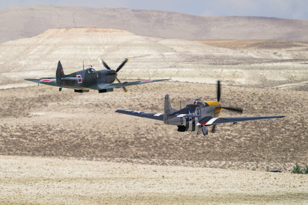 ESKISEHIR, TURKIYE - SEPTEMBER 22, 2024: Supermarine Spitfire LF.IX and North American P-51D Mustang display in Sivrihisar SHG Airshow