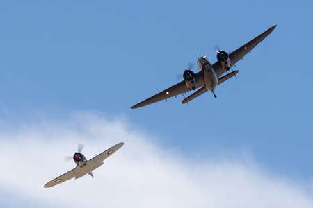Temora, Australia - November 2, 2013: Lockheed Hudson twin engine light bomber and coastal reconnaissance aircraft flying in formation with Commonwealth Aircraft Corporation Boomerang fighter aircraft.