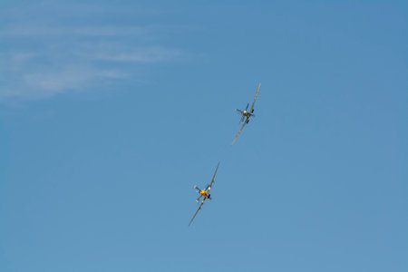 Pair of military aircraft of Red Army attack Luftwaffe fighters. Reconstruction of battle of World War II during the crossing of Dnieper River in 1943.