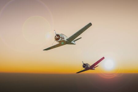 Two retro planes fly high in the sky togther. Teamwork or double effort concept