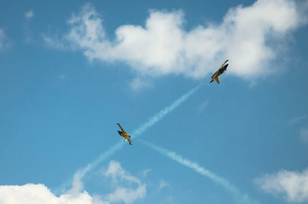 Aerobatics planes flying in the sky with clouds in the background