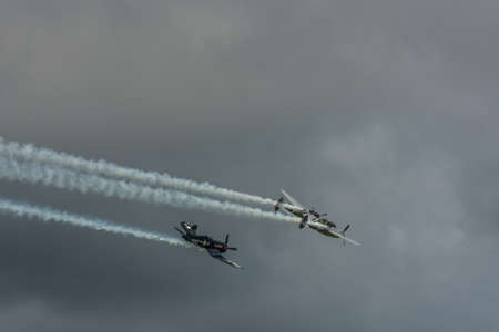 two propeller planes with smoke while dense rainclouds at a air show in the summer