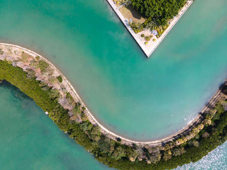 Aerial View or Drone Shot. Bridge in the middle of a green lake