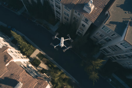 A high-tech drone is maneuvering above a contemporary apartment complex, providing a unique aerial perspective of the building layout on a sunny day.