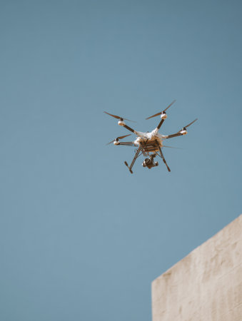 A quadcopter drone hovers in the sky above a building, capturing aerial views on a sunny day in an urban environment.