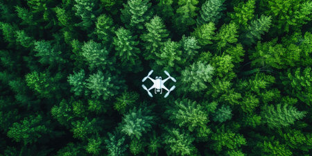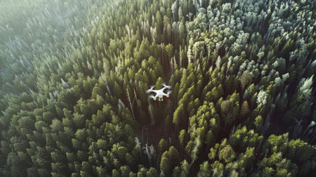 An AI-powered drone flies over a reforestation area, collecting data to aid new forest growth, showcasing the intersection of advanced technology and nature in conservation efforts.