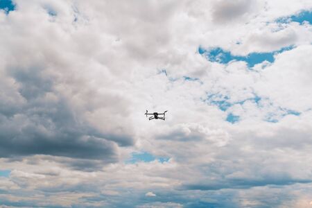Grey drone with camera flying in the air outdoors. Little drone flying outside in sky.
