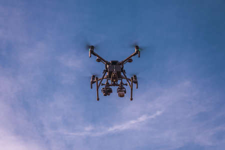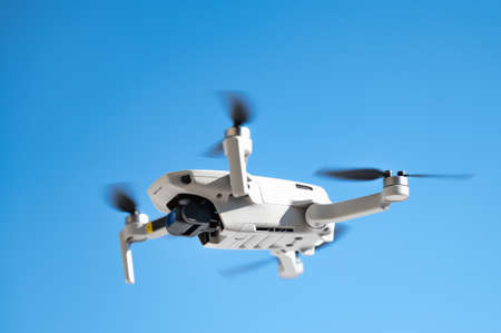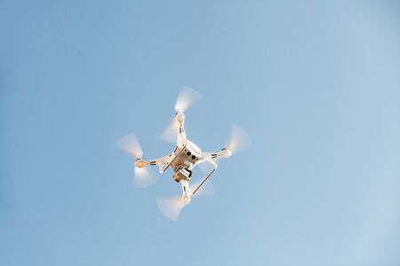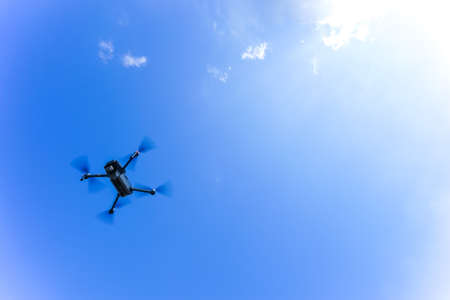 A drone or quadrocopter flies against a blue sky. Modern technology for photographing and filming a bird's eye view.