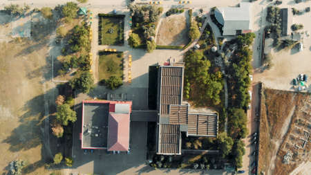Top view of the new colorful residential area on a summer evening. Motion. Top view of the new residential area with playgrounds and Parking for cars.