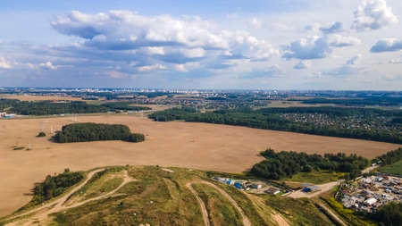 Closed city dump. Restoration of the territory. Landscaping of a large hill of garbage. On the background is a metropolis and a blue sky with clouds.
