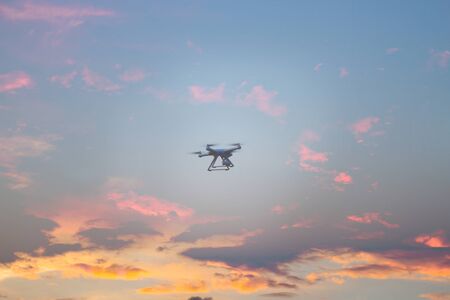 Close up of professional remote control drone flying against dramatic sunset sky background.