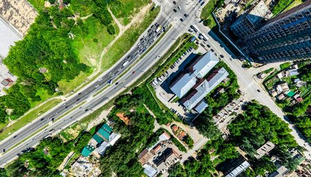 Aerial city view with crossroads and roads, houses, buildings, parks and parking lots. Sunny summer panoramic image