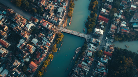 An aerial view showcases a lively riverside area where people traverse a bridge. Colorful rooftops cluster around water, indicating a vibrant urban setting.
