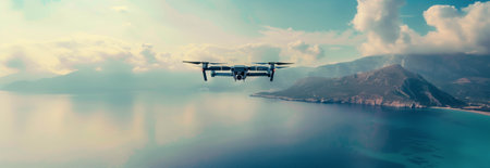 drone quadcopter helicopter in the air, in a clear blue sky, morning fog and mountains below. aerial photo and video shooting using gadgets and modern devices