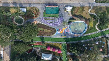 Aerial view of a picturesque botanical garden situated along the Kok River in Chiang Rai, Thailand.