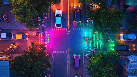 Aerial view of a bustling urban intersection at night, showcasing colorful traffic lights, vehicles in motion, and pedestrians navigating the vibrant street scene.