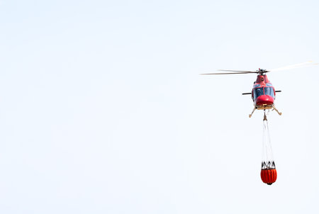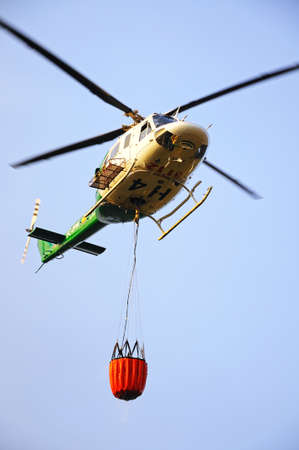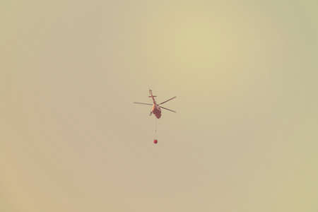 Fire fighting helicopter carry water bucket to extinguish the forest fire