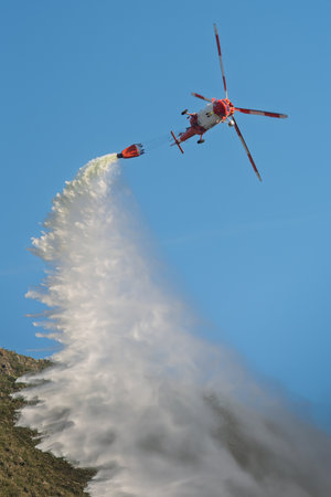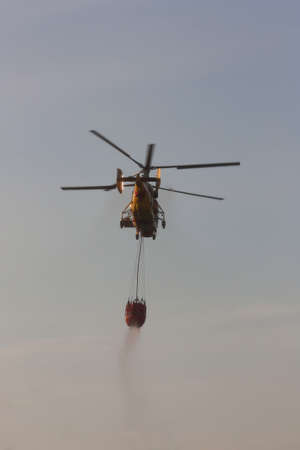 POMBAL, PORTUGAL - SEPTEMBER 22: Fire rescue helicopter, with water bucket, after water drop on Wildfire, in Pombal, Portugal on Setember 22, 2012