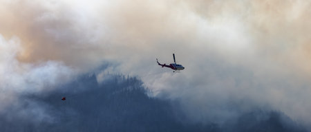 Wildfire Service Helicopter flying over BC Forest Fire and Smoke on the mountain near Hope during a hot sunny summer day. British Columbia, Canada. Natural Disaster