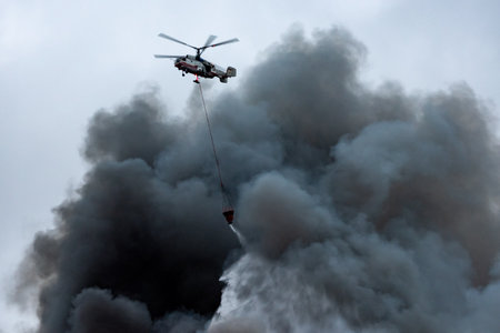 A fire helicopter carries a container of water to extinguish a fire in a production building