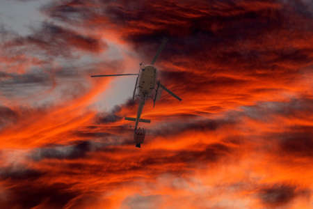 Helicopter of fires throwing water on the mountains at sunset. Firefighter concept and extinguishing fires.