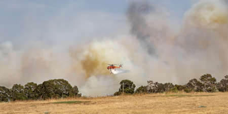 Bundoora, Australia - December 30, 2019: Erickson Air Crane helicopter dropping a large load of water onto a bushfire.