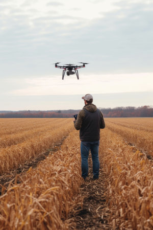 shot of a man flying a drone over fields, created with generative ai