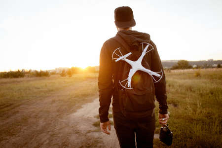 Young man with drone go to sunset, free space. Back of guy with quadrocopter in backpack and remote controller in hand, walking in meadow. Leisure, adventure, fun, going home concept