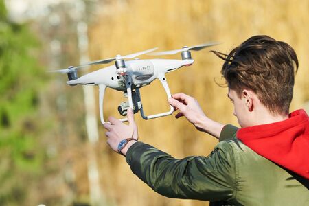 drone flying. Young man with copter outdoors