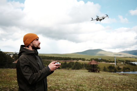 Man operating a drone using a remote controller