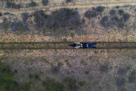 Couple lying on a rail track drone aerial top view on a desert landscape