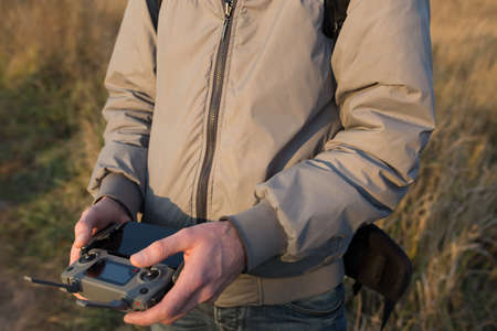 A man holds a drone control panel in his hands close-up.
