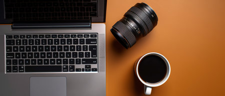 Laptop, camera and cup of coffee on orange background. Top view. generative ai
