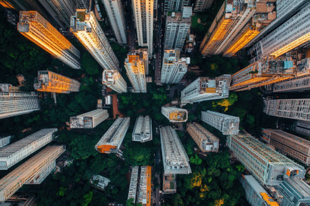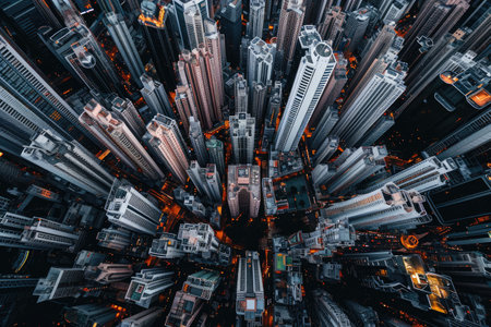 Stunning aerial view of a bustling urban cityscape at dusk, showcasing towering skyscrapers illuminated by city lights. The intricate layout reveals dynamic energy and architectural beauty.