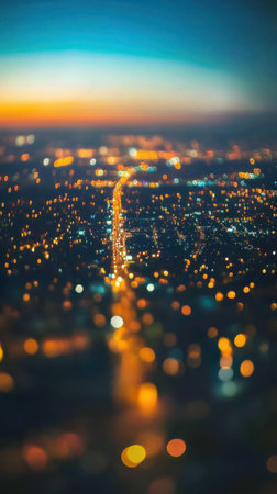 Experience the breathtaking twilight perspective of a bustling metropolitan area showcasing sleek skyscrapers and illuminated streets, reflecting urban vibrancy.