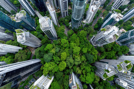 Aerial view of a green park surrounded by modern skyscrapers in a bustling city