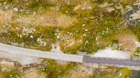 Motorhome camper car van on road trip. Norway mountains landscape. Norwegian national tourist scenic route Sognefjellet. Aerial view