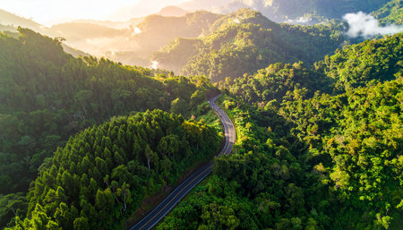 Aerial view of a winding road in the mountains with fog in the morning, An aerial view captures a forest and road surrounded by nature, AI Generated