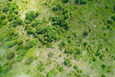 Top view on the bushes and trees in summer. Aerial photography of the landscape.
