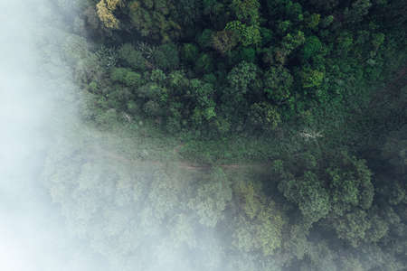 Aerial view green tree forest morning sunrise with fog nature landscape