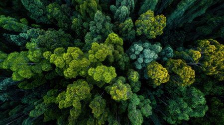 Stunning aerial perspective of vibrant treelines in a natural forest. The image captures the diverse shades of green foliage and dense vegetation canopy, promoting ecological beauty.